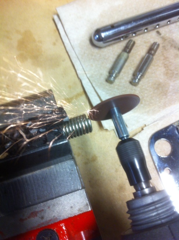 Once I had everything broken down, I decided I would remove about 1/8″ of the coil to start with from the end that fastens to the bottom of the base plate. Using a cutting blade with a Dremel, I went to work on one of the springs, which was secured in a mini-vice.