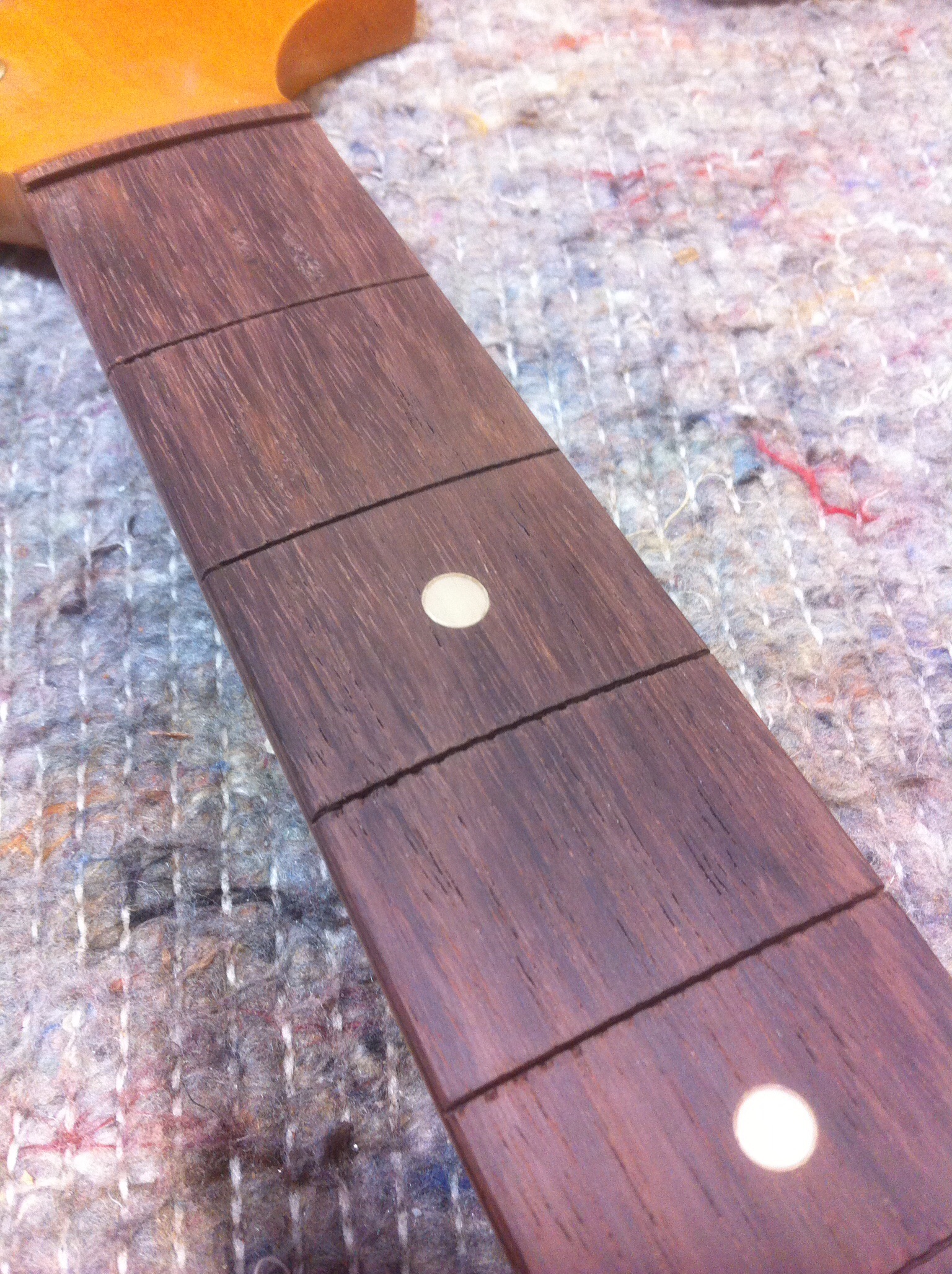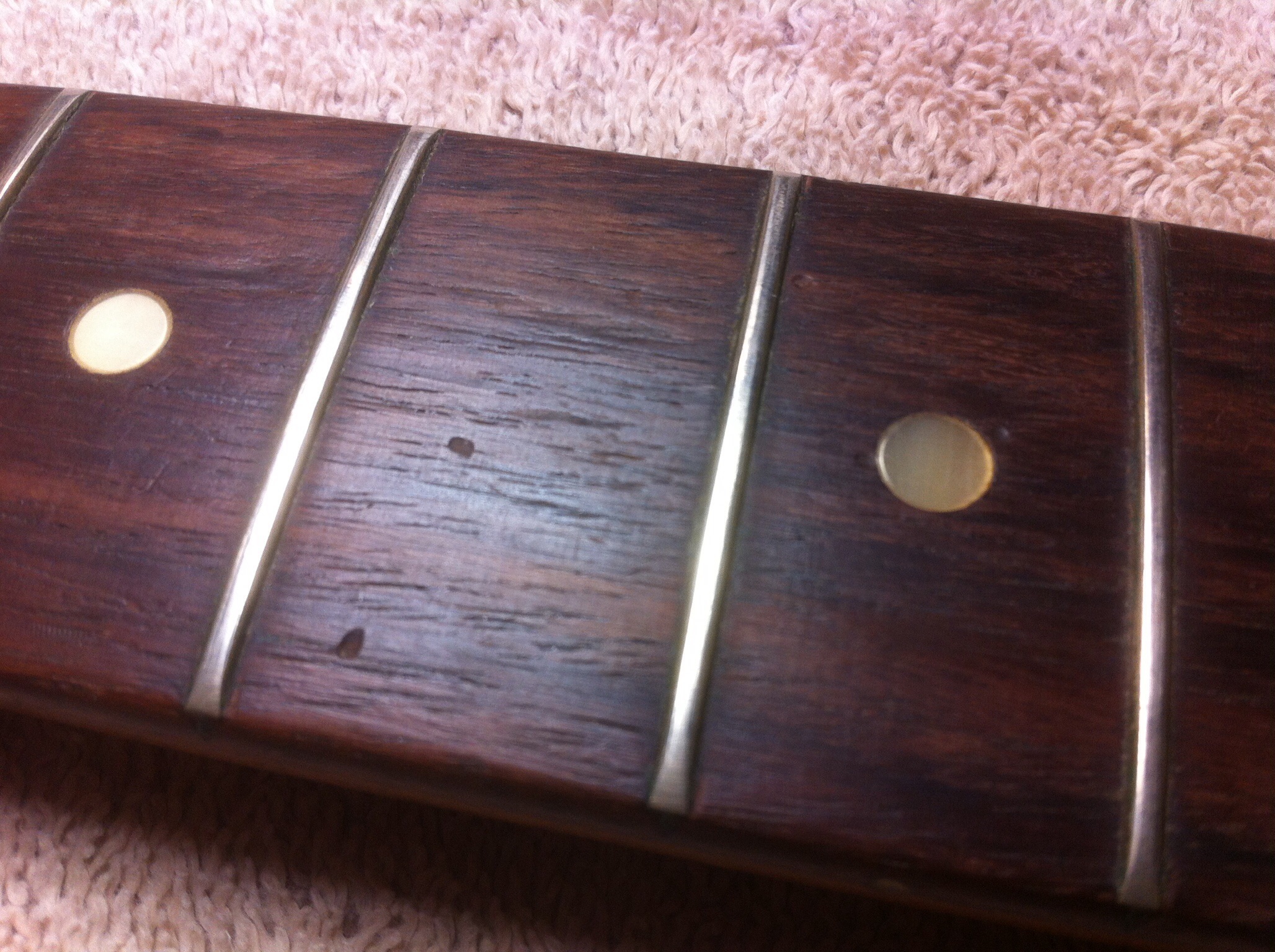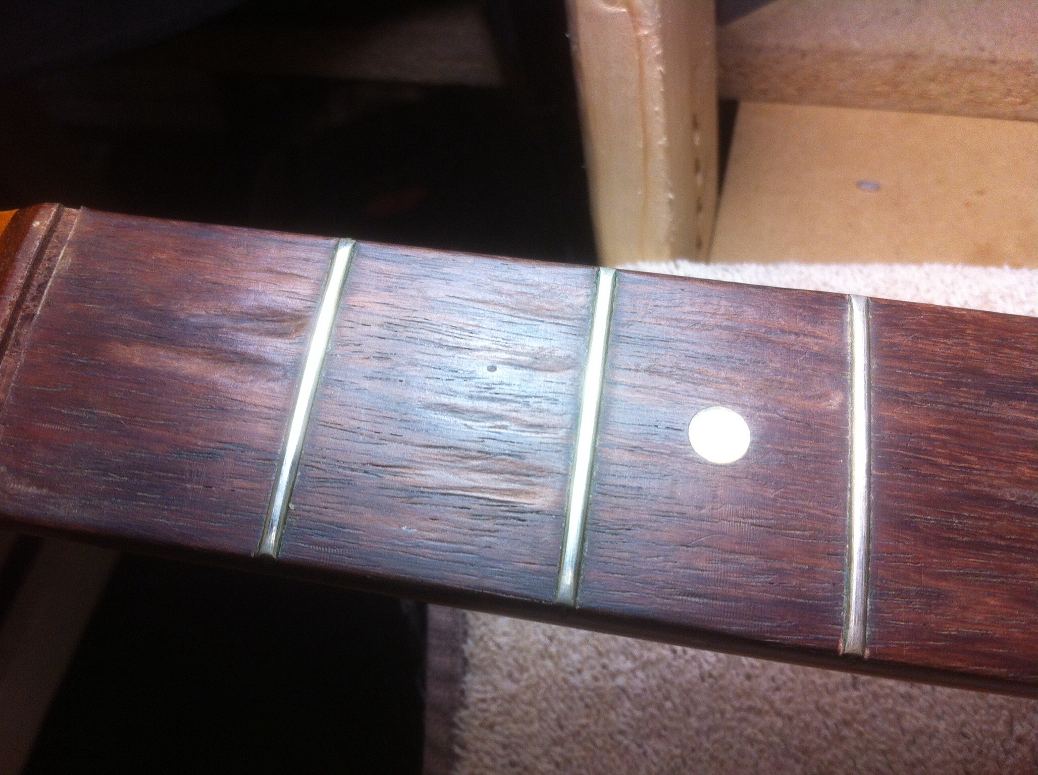 The guitar’s fretboard was nearly 50 years old. As can be seen from the pics here it had been played – a LOT! The original frets were toast, so a refret was a must-do on this neck. The Brazilian rosewood fretboard also had quite a bit of damage from wear and tear, presenting a few places where missing wood needed to be drop filled and replaced.