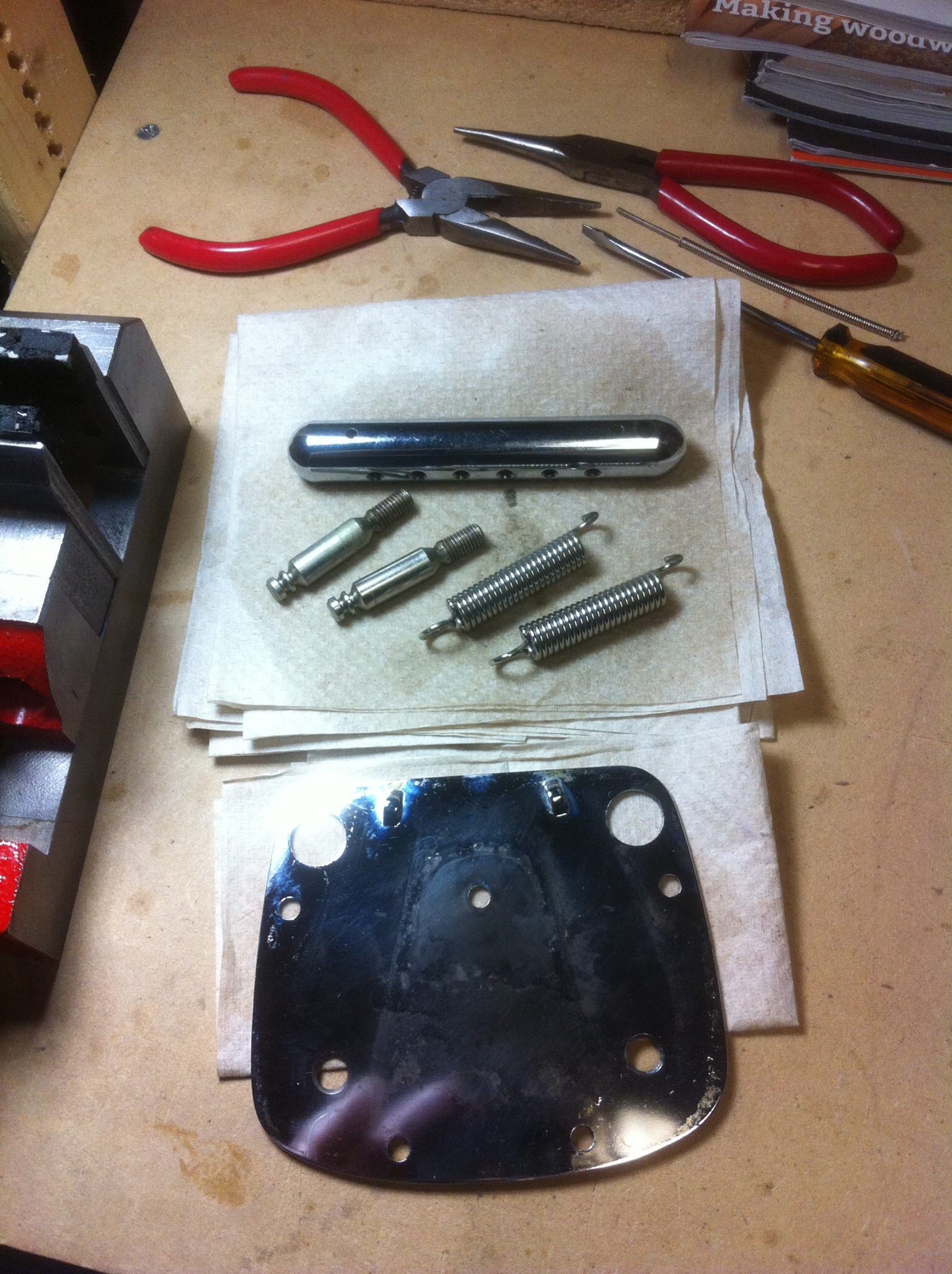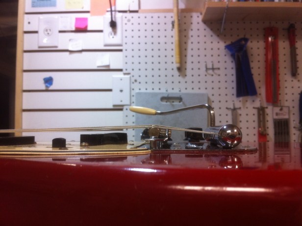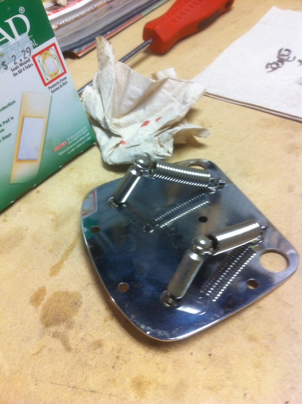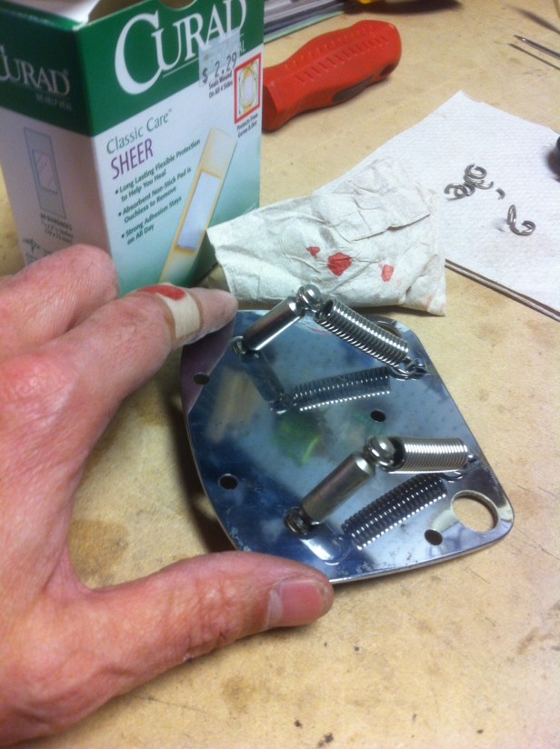 Inside of an hour, and with bleeding knuckles, the Dynamic Fender Vibrato was fully assembled for the second time, hopefully with an ample amount of tension from the shortened springs. I sure didn’t want to have to rinse and repeat the spring shortening exercise again! Just in case, I kept a box of band aids handy.