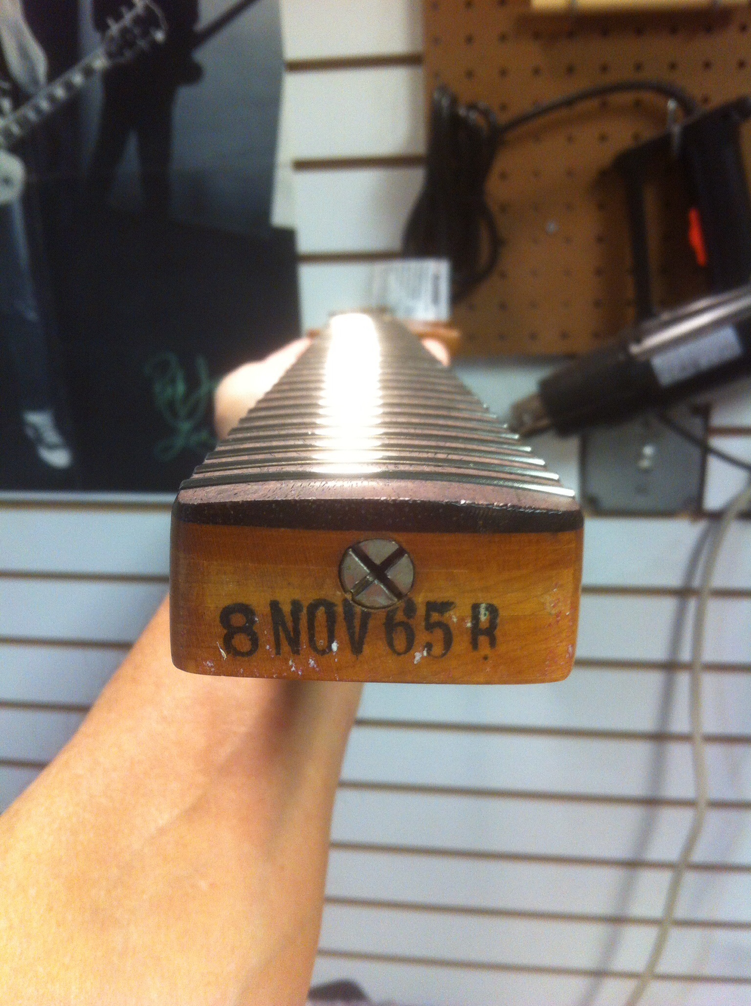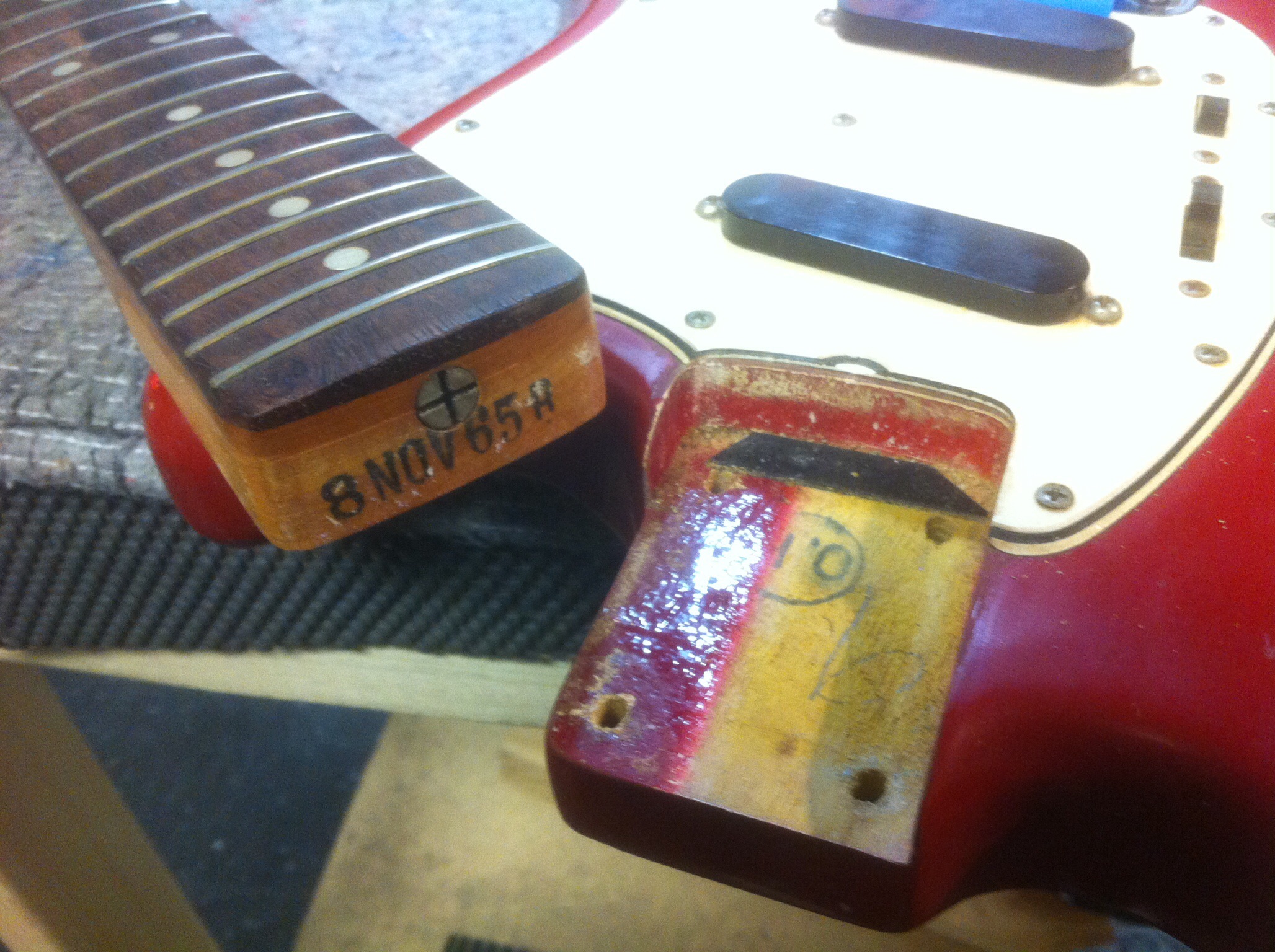 Then lo and behold, as the Karmic wheel spins, this Fender Mustang – a 1965 Dakota Red Fender Mustang, to be exact – in all original condition comes into my Savannah GA workshop in January of 2015 for a refret and restoration. The picture at right shows the instrument disassembled with the date stamp clearly visible on the neck. What a special treat and privilege it was to work on it, too. A real throwback.