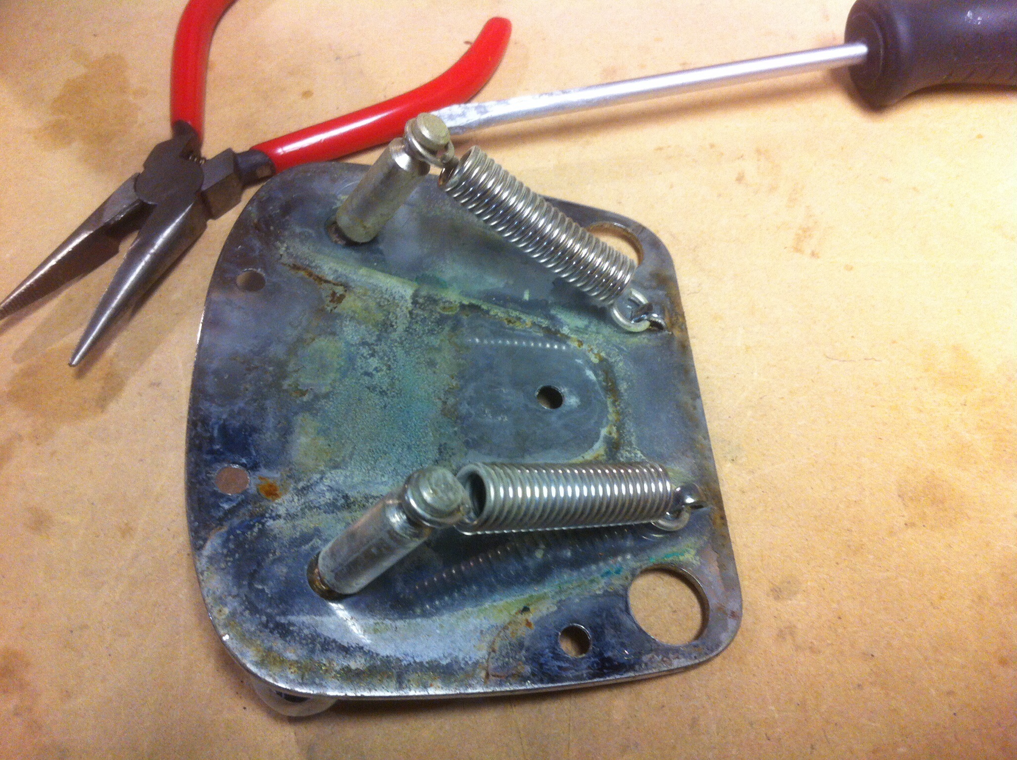 At this point I knew I had to cut the springs shorter on one end, then re-fashion them so they would fasten to the base plate and fulcrum posts again. But which end should I cut from, and how much material should be removed from these tired old springs? And most importantly, would it even work? Clearly, I was in for a long day. I removed the strings, removed the Dynamic Fender Vibrato from the guitar and disassembled it again for the second time.