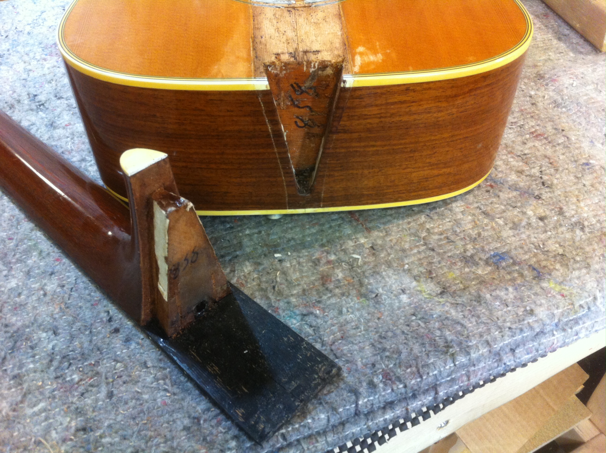 Once the neck and body have been successfully disassembled precise modification of the neck joint (in this case a dovetail joint) is done to promote better playing action when reassembled. This is a woodworking job! Sharp chisels, rasps, sand papers, a steady hand guided by patience, and, of course, the “luthier’s intuition” that comes by way of experience, are essential to go at this task and get it done effectively.