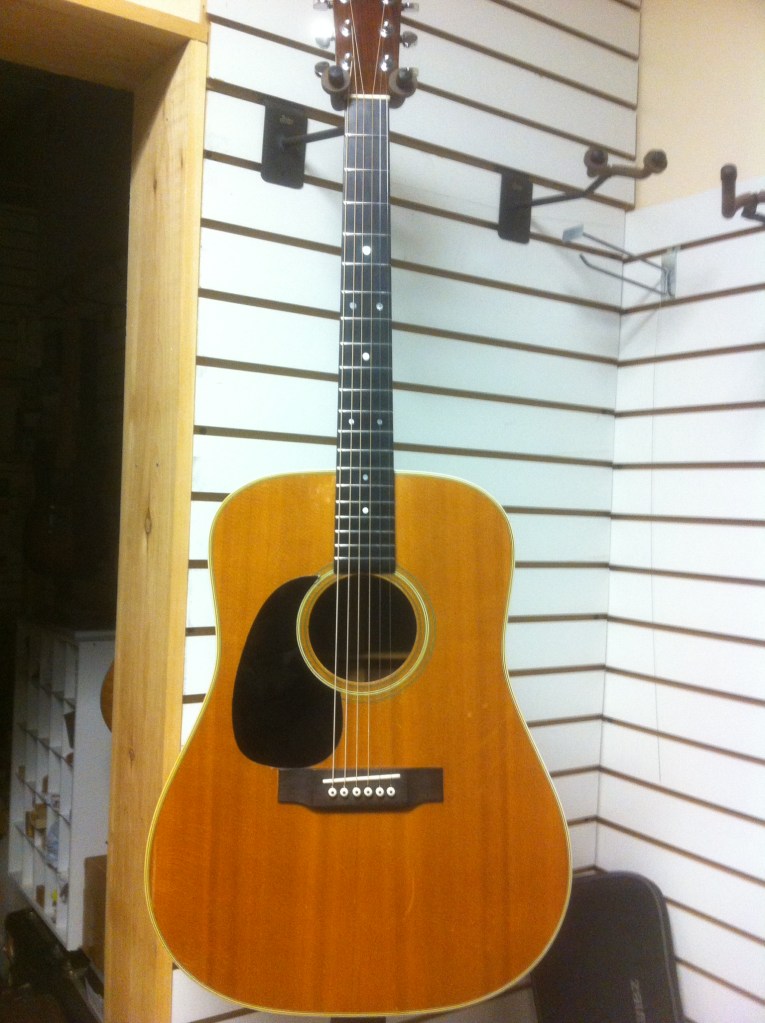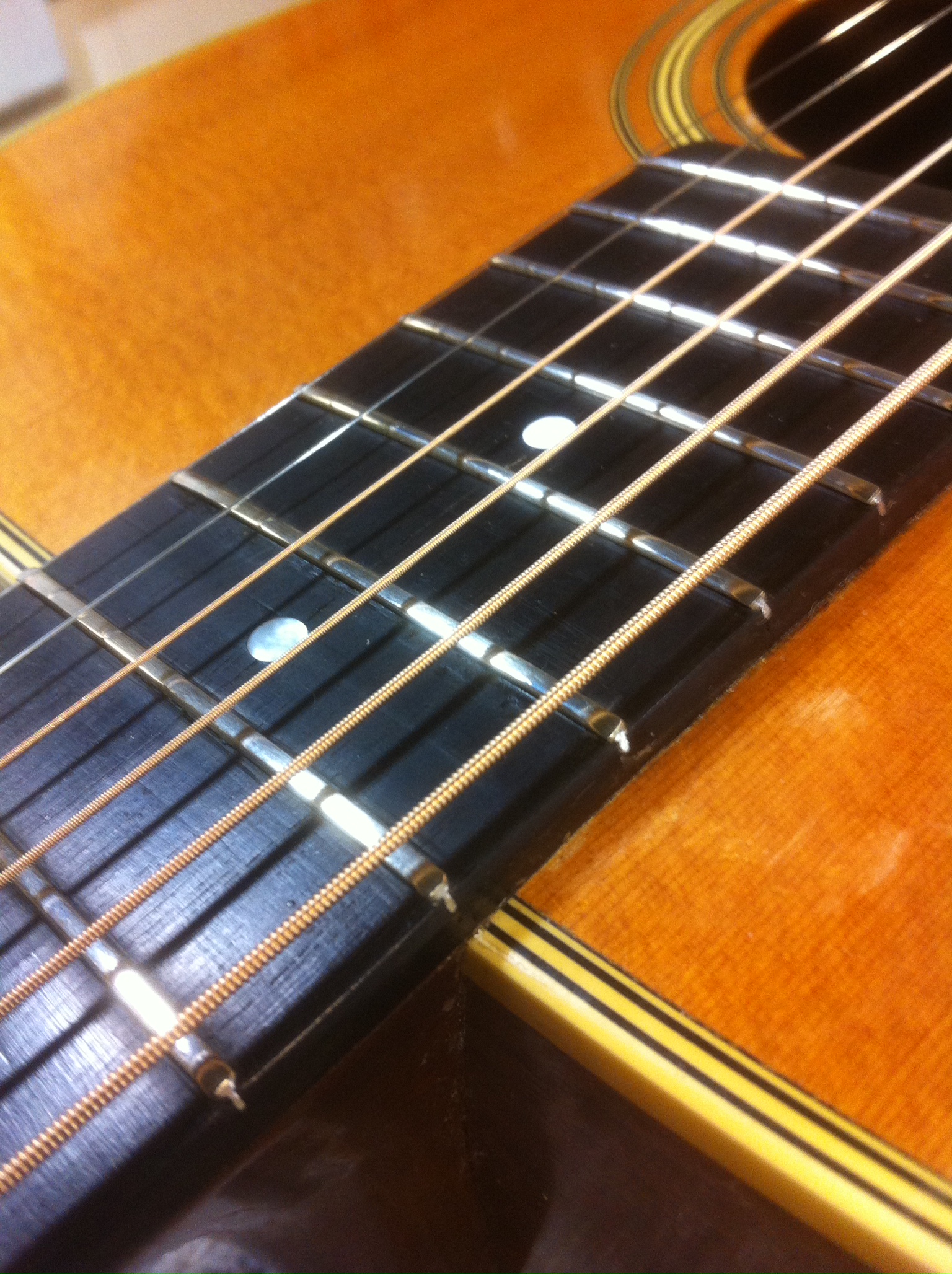 A Martin D28-L, sn 367858. Manufactured by C.F. Martin in 1975. This repair involved a neck reset, a new bone nut and compensated bone saddle, both hand-carved, and then the instrument was restrung and setup to the player’s specifications. This neck reset repair was completed in January 2015, when my business, Coastal Guitarworks, was located on Abercorn St. in downtown Savannah GA. The guitar was originally built to accommodate a left handed player (hence the “D28-L” model type), and had been converted to right hand at some point, presumably by the current owner who was right handed. For some reason or another the pickguard was left in it’s original orientation, as depicted in the pictures below. This might have been done to avoid an added expense of refinishing the top, which was customarily left unfinished beneath pickguards on Martin guitars of that era. On the down side, these guitars often developed hairline cracks along the grain on the tops below the pickguards due to the shrinking of the pickguard over time and as the unfinished wood underneath aged disproportionately to the surrounding finished top. Fortunately this Martin exhibited none of those anomalies.