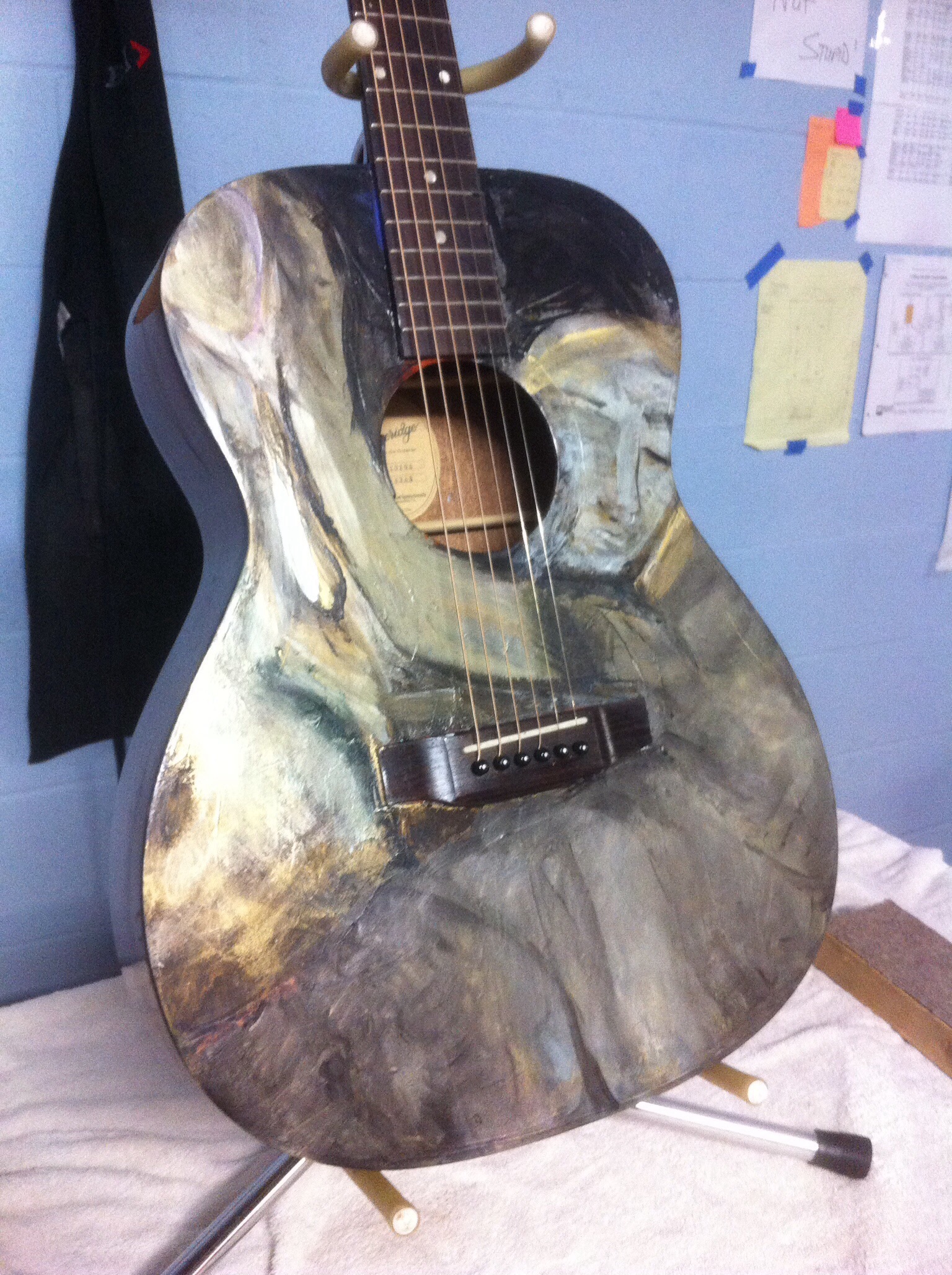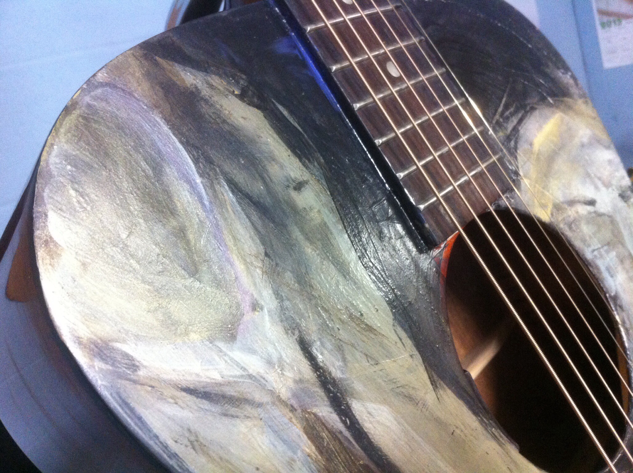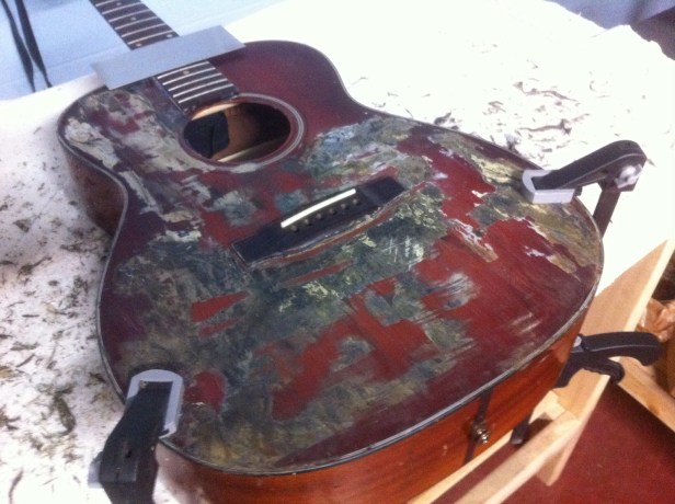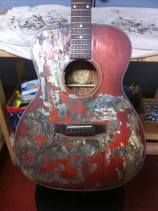 One fine sunny day in May of 2015 another Savannah songwriter called me with an unusual repair request. “Can you remove the angel I had someone paint on the top of my guitar?” Hmmm… I said, “I don’t know. Check it in and I’ll check it out!” So he did. It was nasty, real nasty. And I’m trying to “Ac-Cent-Tchu-Ate the Positive” here.