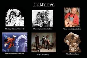 At the bottom of this page there is a funny little meme about luthiers. It illustrates what people on the outside looking in think we who do this crazy stuff actually do. I’ve never promised to make someone a better guitar player just by servicing their instrument. Making you a better guitar player is largely on you! What I can say is something I learned long ago as a young guitar player noodling on his own guitars and those of his compadres: When you have an instrument that’s put together well, with a killer setup that just “invites” you to play, you’re going to be inspired by that. Indeed. You’ll move heaven and earth some days just to play your guitar!